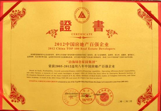 2012年3月23日,由國(guó)務(wù)院發(fā)展研究中心企業(yè)研究所、清華大學(xué)房地產(chǎn)研究所和中國(guó)指數(shù)研究院三家單位共同主辦的 "2012年中國(guó)房地產(chǎn)百?gòu)?qiáng)企業(yè)研究成果發(fā)布會(huì)" 在北京釣魚(yú)臺(tái)國(guó)賓館舉行。沿海綠色家園集團(tuán)自2005年起,連續(xù)八年榮膺“中國(guó)房地產(chǎn)百?gòu)?qiáng)企業(yè)稱號(hào)”,百?gòu)?qiáng)排名名列第42位。