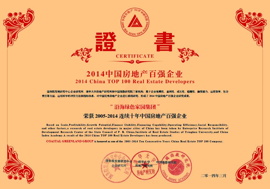 2014年3月27日上午,北京釣魚臺國賓館嘉朋滿座,由國務(wù)院發(fā)展研究中心企業(yè)研究所、清華大學(xué)房地產(chǎn)研究所和中國指數(shù)研究院三家單位共同主辦的房地產(chǎn)盛會——“2014年中國房地產(chǎn)百強(qiáng)企業(yè)研究成果發(fā)布會”在此隆重舉行,沿海綠色家園集團(tuán)不負(fù)眾望,連續(xù)十年獲頒“中國房地產(chǎn)百強(qiáng)企業(yè)稱號”殊榮。