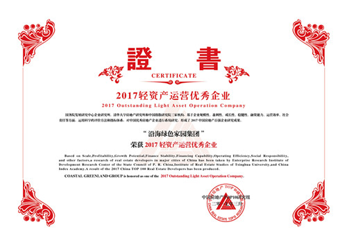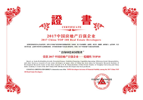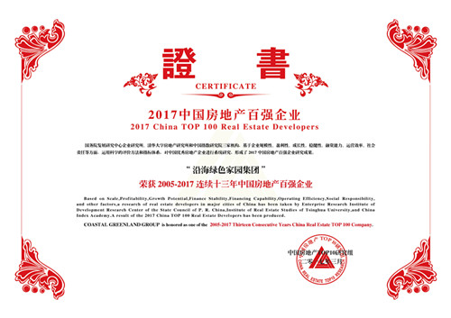 2017年3月16日,由國務院發展研究中心企業研究所、清華大學房地產研究所和中國指數研究院三家單位共同主辦的“2017中國房地產百強企業研究成果發布會暨第十四屆中國房地產百強企業家峰會”在北京釣魚臺國賓館隆重舉行。沿海綠色家園集團(以下簡稱沿海集團)此次榮獲“2005-2017連續十三年中國房地產百強企業” 、“2017中國房地產百強企業——穩健性TOP10”和“2017輕資產運營優秀企業”三項殊榮。