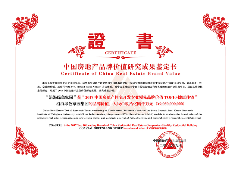 2017年9月14日,由國務院發展研究中心企業研究所、清華大學房地產研究所和中國指數研究院三家研究機構 “2017中國房地產品牌價值研究成果發布會”在北京雁棲湖國際會議中心召開,沿海綠色家園集團(以下簡稱“沿海集團”)憑借其清晰的品牌定位、企業經營的穩健性、在健康住宅細分市場的領先優勢,以及對行業和社會的貢獻獲得了社會各界的肯定,連續13年榮獲中國房地產TOP10研究組頒發的“中國房地產專業領先品牌價值TOP10—健康住宅”榮譽,并憑借其在房產開發、城市發展運營、健康生活服務等多個領域的突出表現,連續14年位居“中國房地產公司品牌價值TOP10”的行列,品牌價值躍升至90.6億,創歷史新高。同時,沿海集團行政總裁夏向龍先生入選“2017年中國房地產品牌貢獻人物”