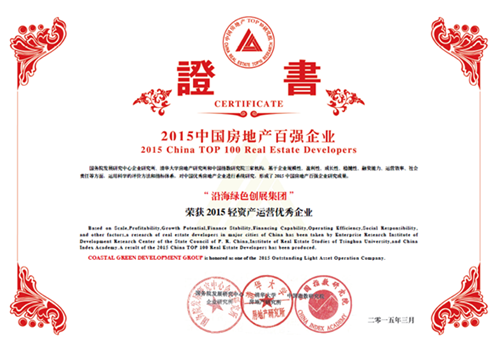 沿海綠色家園集團(以下簡稱“沿海集團”)連續(xù)十一年獲頒“中國房地產(chǎn)百強企業(yè)稱號”殊榮,同時被授予“2015年中國房地產(chǎn)百強企業(yè)——百強之星”的稱號,張亞峰副總裁代表沿海集團上臺領(lǐng)獎,并與來自全國各地的眾多同行分享了房地產(chǎn)輕資產(chǎn)運營的經(jīng)驗。
