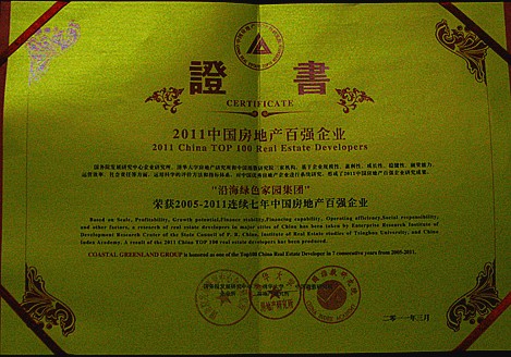 2011年3月25日 , 由國務院發展研究中心企業研究所、清華大學房地產研究所、中國指數研究院三家機構共同主辦的 " 2011中國房地產百強企業研究成果發布會暨第八屆中國房地產百強企業家峰會 " ,在北京釣魚臺國賓館召開 , 現場發布了2011中國房地產百強企業研究最新成果,沿海集團獲得“2011中國房地產百強企業”稱號,百強企業排名第42位。這是自2005年起,沿海連續七年獲得百強企業稱號。